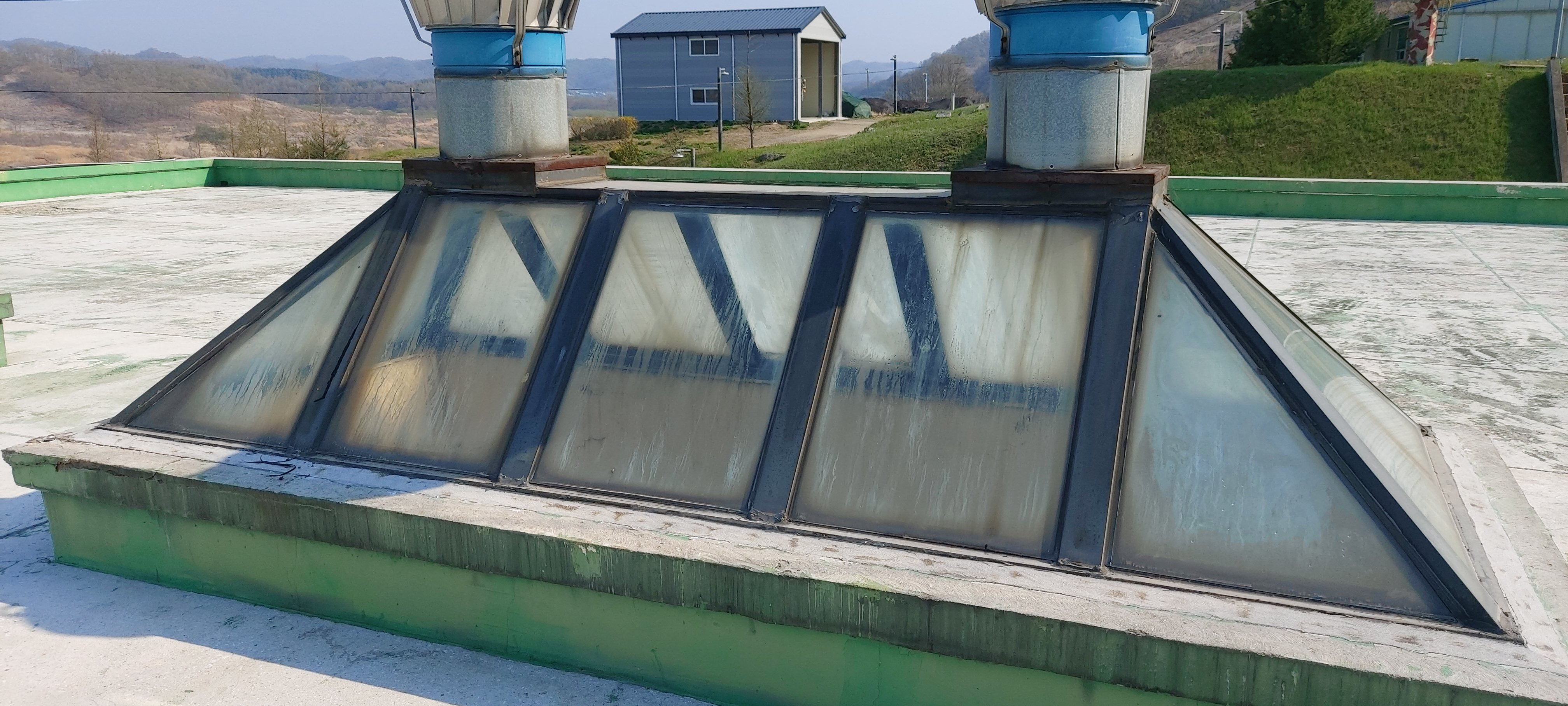빛이 유입되도록 유리 구조물을 설치하고 그 위에 자연통풍이 되도록 환기구를 설치했다. 유리와 샷시에 시공된 코킹이 노후 되어 누수가 있는 관계로 코킹을 새로이 시공한다.