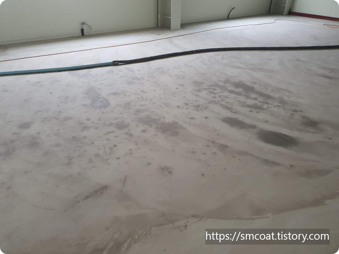 동해 입은 콘크리트 바닥을 노출로 마감할 경우 메꿈 작업을 한 흔적이 남는다.